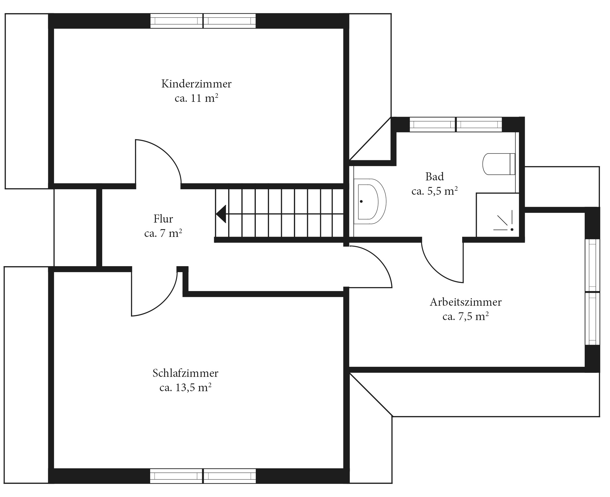 Die beiden Schlafzimmer im Dachgeschoss haben Decken, die bis zum First geöffnet sind, was den Räumen eine besondere Großzügigkeit verleiht. Die Außenrollläden in den Schlafzimmern sind elektrisch und über eine App steuerbar. Im Haus befinden sich zwei Bäder sowie ein Gäste-WC. Das Duschbad und das Gäste-WC sind modern und hochwertig ausgestattet.